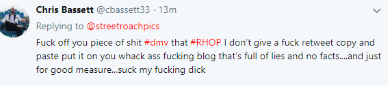 Real Housewives of Potomac husband Chris Bassett may need his keyboard washed off with soap. The 40 years 1/2 percent owner of a restaurant posted this tweet to a blogger.
